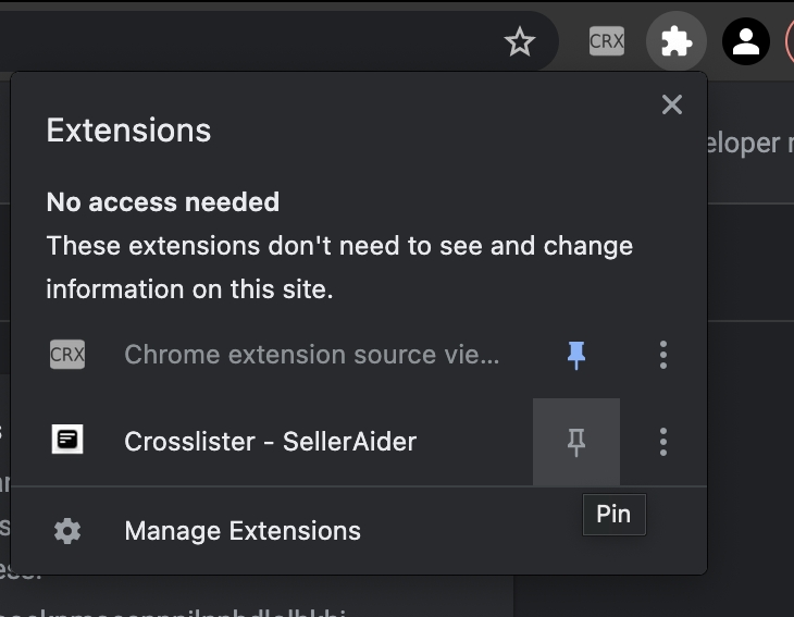 Cliquez sur la pièce de puzzle en haut à droite de votre navigateur Chrome puis cliquez sur l'icône de l'épingle à côté de Crosslister.;