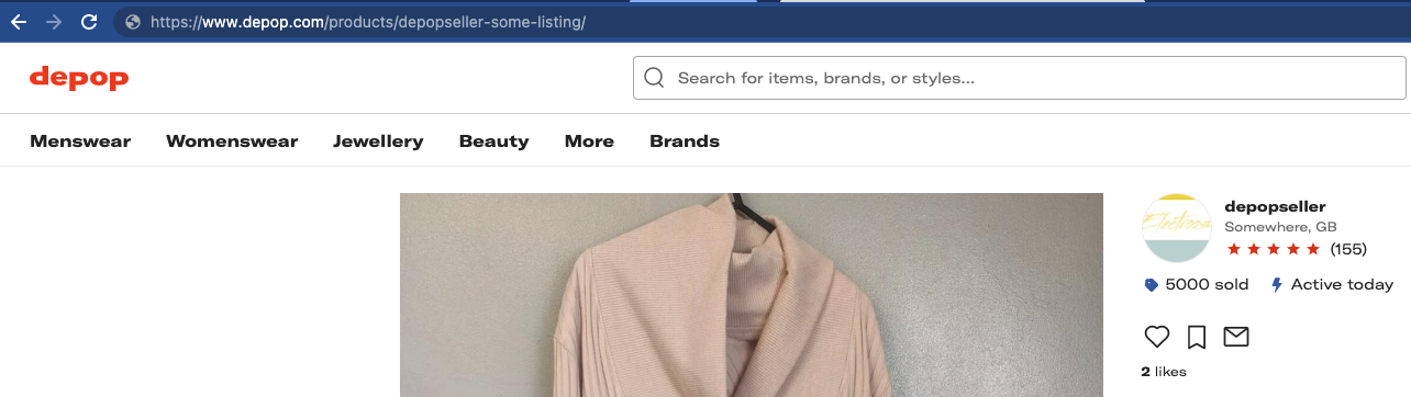 Lorsque vous associez une liste d'inventaire à une liste depop, vous devriez entrer l'URL de votre page de détail du produit depop. Il s'agit de la page à laquelle vous êtes dirigé après avoir cliqué sur une de vos photos de liste sur depop.