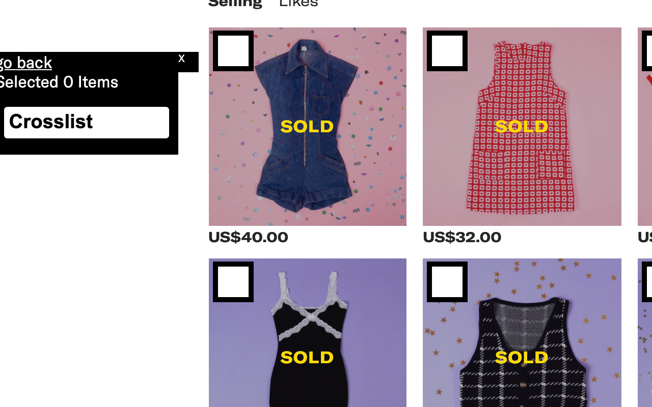Vous pouvez commencer à crosslister en visitant votre page de profil sur l'un des marchés pris en charge. Cliquez sur le bouton 'Sélectionner les articles'. Ceci ajoutera une case à cocher à chaque image de produit que vous voyez sur la page. Vous pouvez retirer les cases à cocher en cliquant sur 'retour en arrière'.